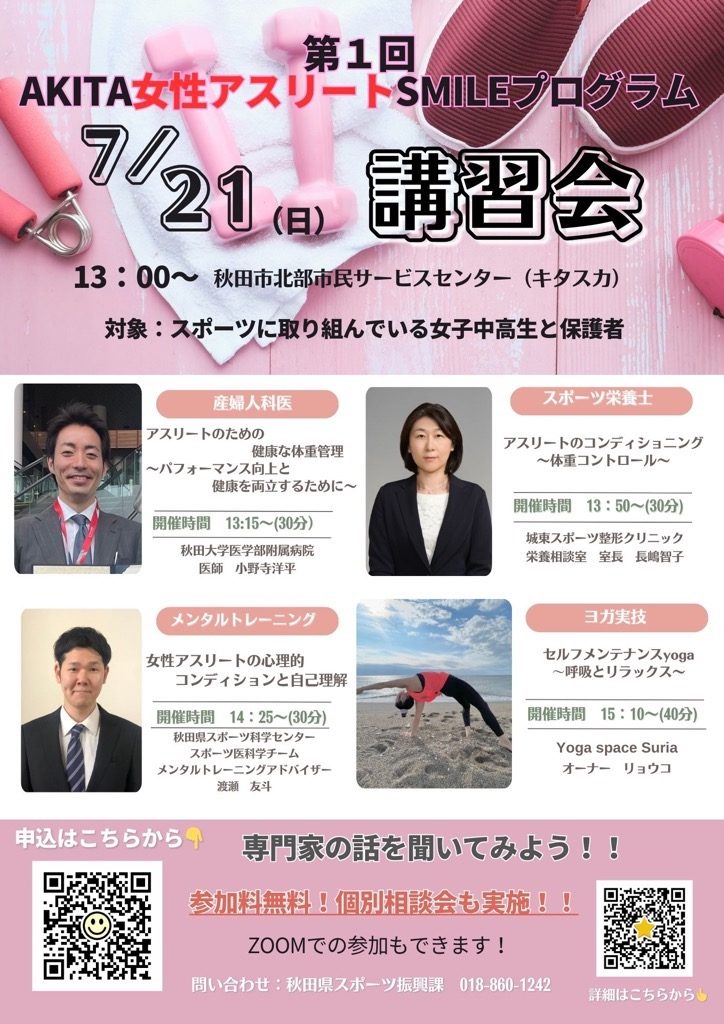 第1回AKITA女性アスリートSMILEプログラム 選手・保護者対象講習会、指導者対象講習会募集開始!!